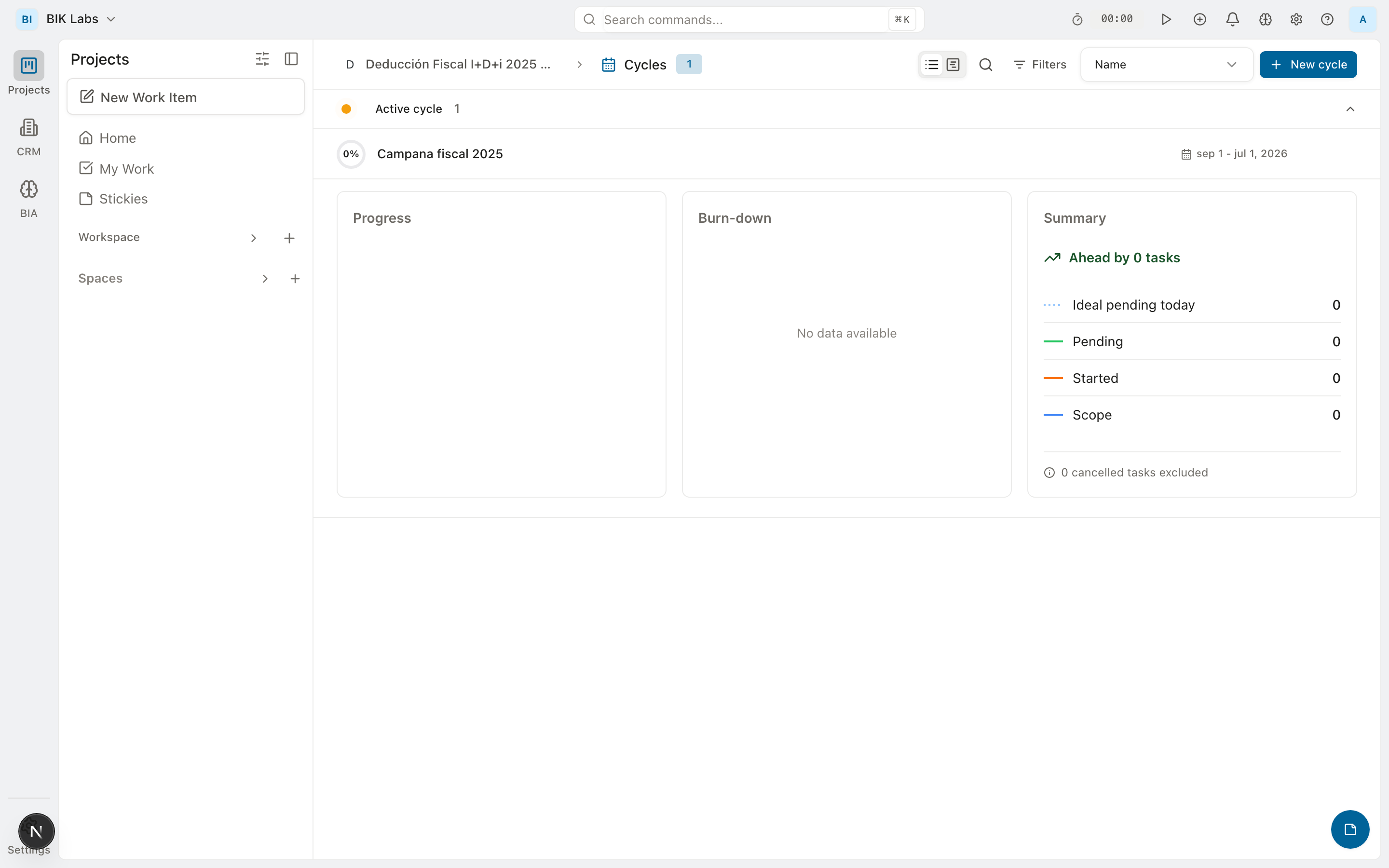 Semanal, bisemanal, mensual, personalizada. BIK Labs crea ciclos futuros automaticamente segun tu cadencia. Planifica arrastrando work items al ciclo. El alcance queda definido desde el inicio.