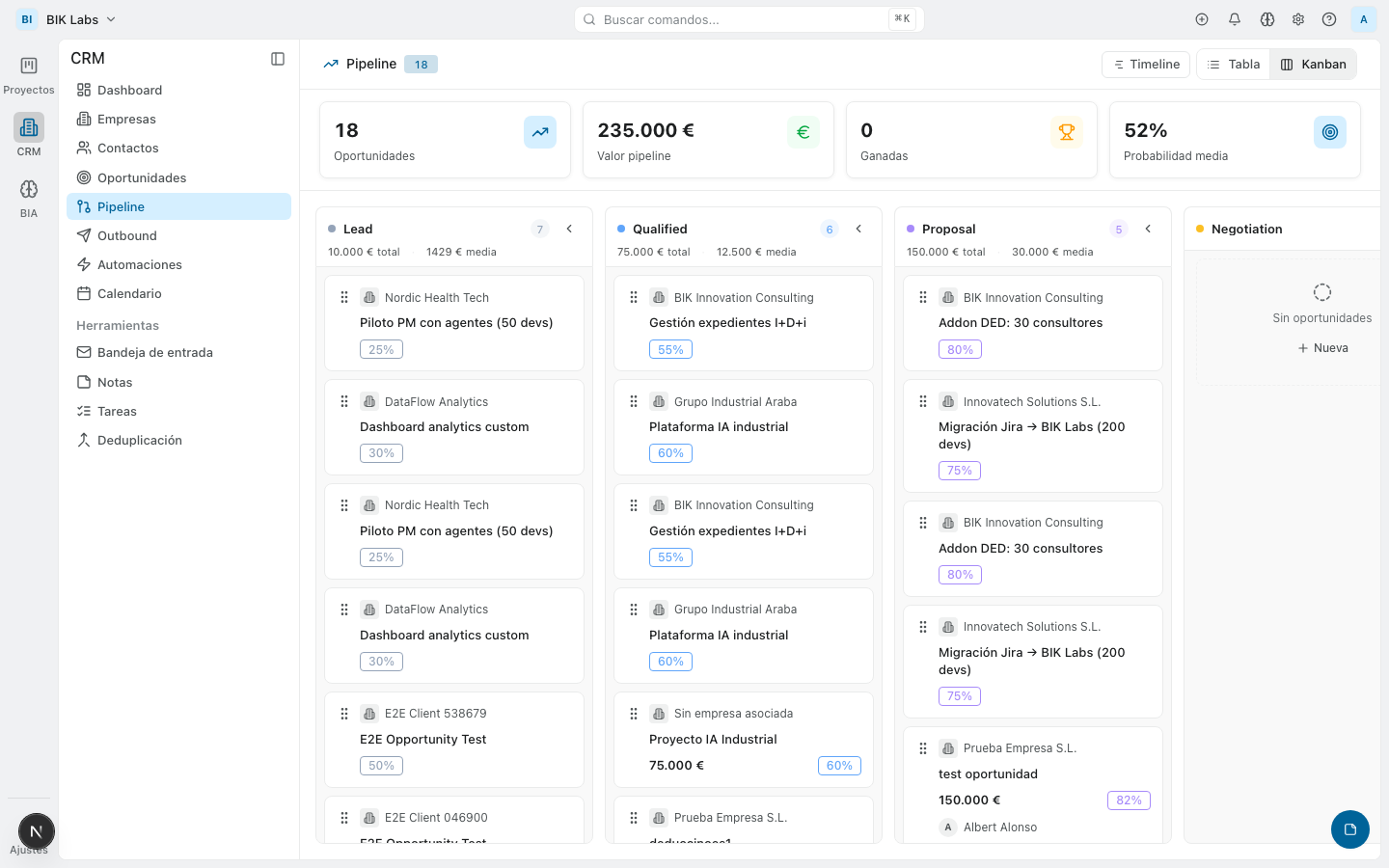 BIK Labs tiene un CRM real: empresas con campos completos, contactos vinculados, oportunidades con valores, pipeline visual con Kanban y Gantt, automaciones con historial. Todo conectado con tus proyectos — sin cambiar de herramienta.