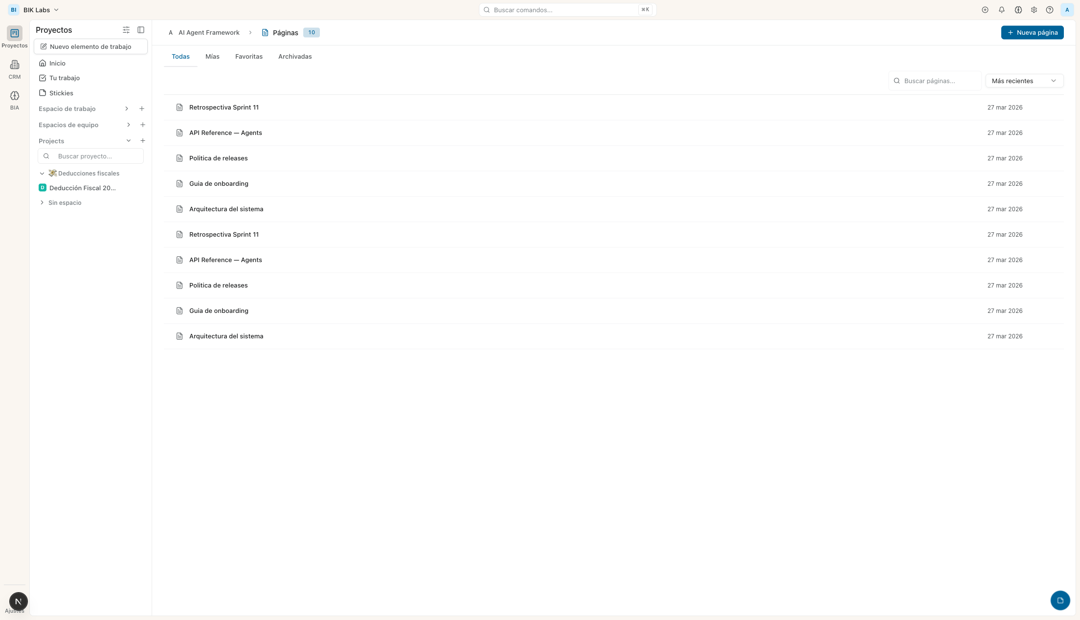 La documentación en Notion o Confluence está desconectada del trabajo real. Actualizas el spec pero no el ticket. Cierras la tarea pero no el doc. BIK Labs elimina esa desconexión — la wiki vive dentro del PM.